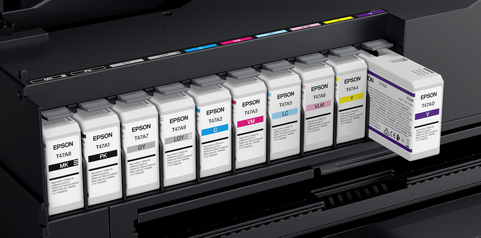 Encre Ultrachrome® Pro10 : Cartouches 50 ml Cyan, Magenta, Noir photo, Noir mat, Gris, Gris clair, Jaune, Magenta clair, Cyan clair, Violet